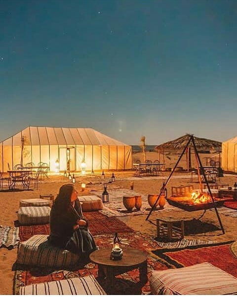 This night in Merzouga desert camp, will give you a chance to ride camels and cross the sand dunes. Thereafter you will enjoy the sunset of a lifetime over a high dune. Besides, you will explore the landscapes of the Sahara desert. Then, when you reach the camp you get a cup of tea before you get your tent. After dinner, you can play some Berber music with the staff around the fire. Also, you will enjoy a starry sky. In addition, you will enjoy a wonderful sunrise in the early morning. Then, take camels back to the village of Merzouga after breakfast.